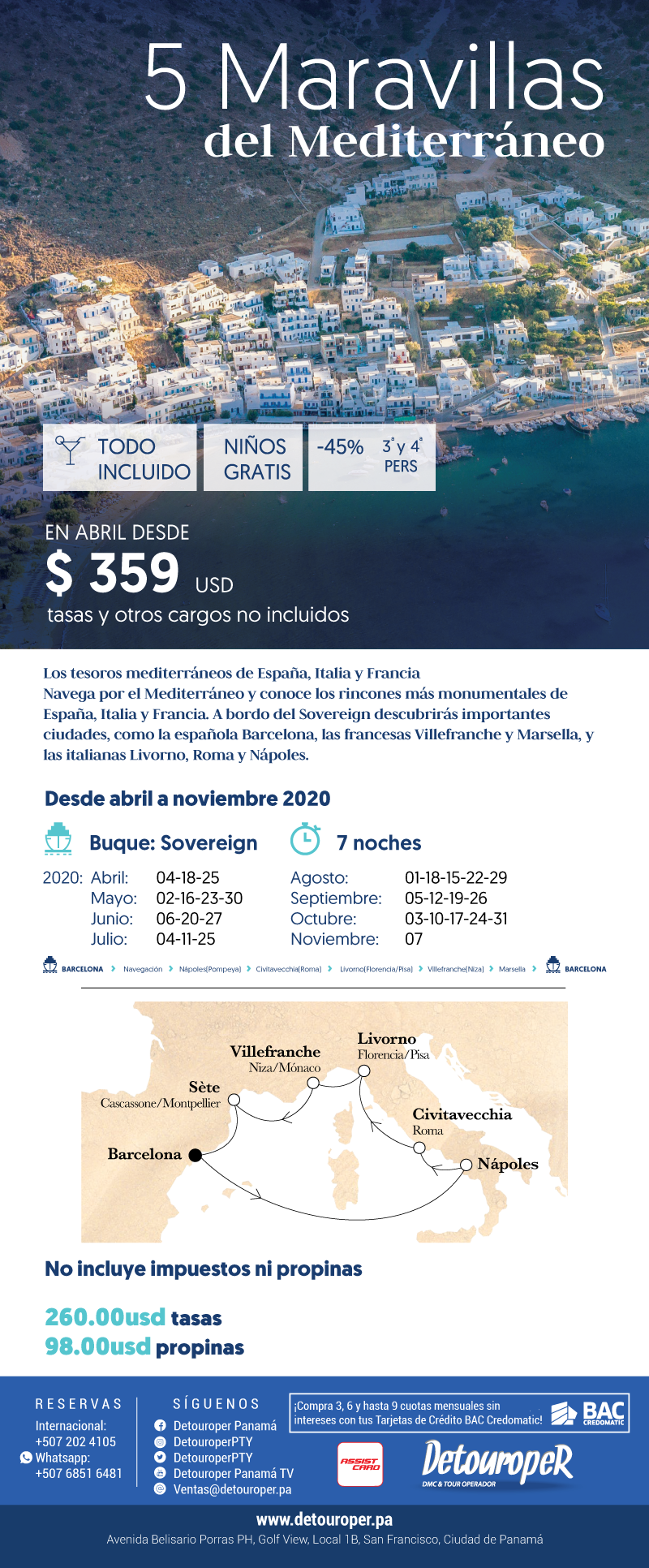 Los tesoros mediterráneos de España, Italia y FranciaNavega por el Mediterráneo y conoce los rincones más monumentales de España, Italia y Francia. A bordo del Sovereign descubrirás importantes ciudades, como la española Barcelona, las francesas Villefranche y Marsella, y las italianas Livorno, Roma y Nápoles.