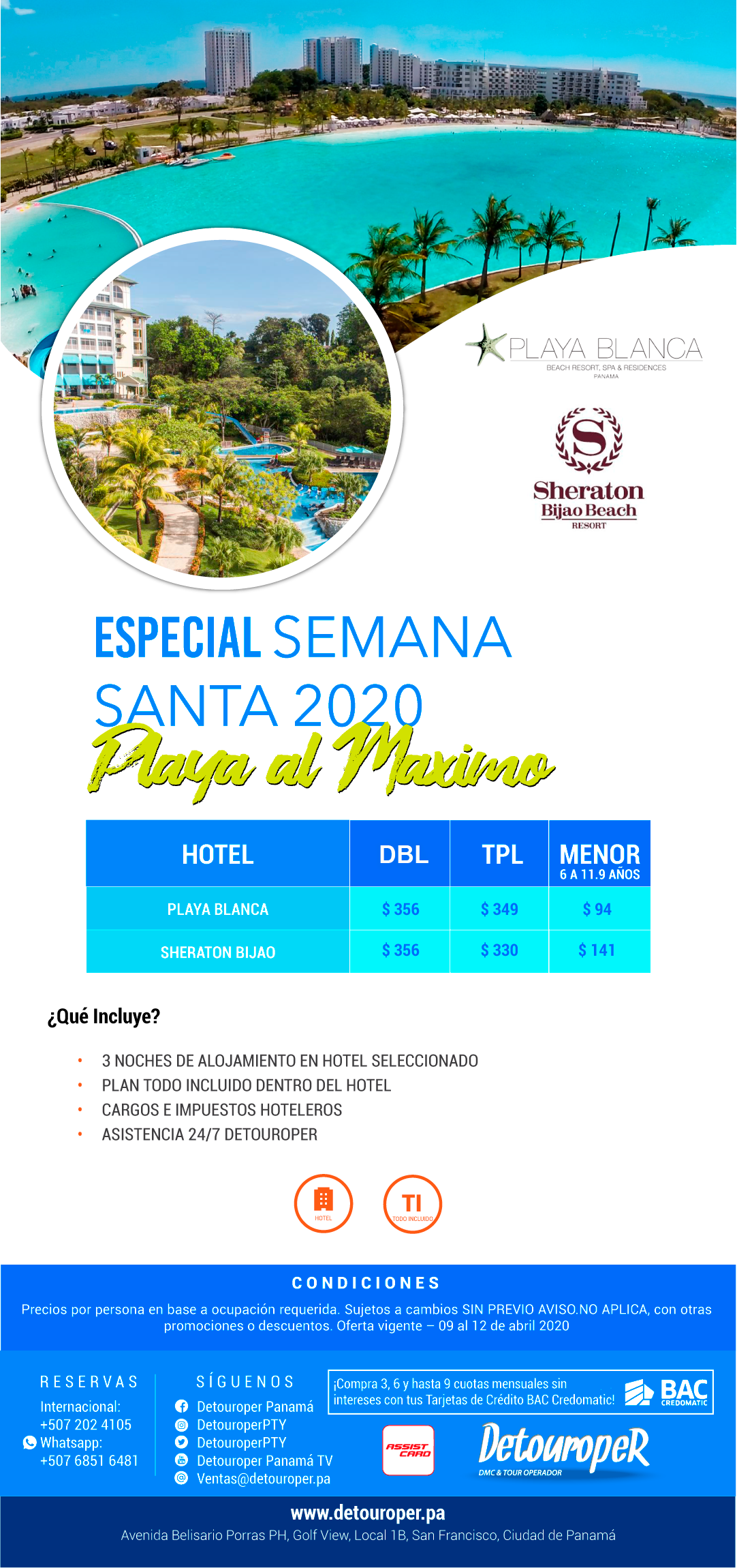PLAYA AL MÁXIMO 09-12 ABRILINCLUYE3 noches de alojamiento en hotel seleccionadoPlan todo incluido dentro del hotelCargos e impuestos hotelerosAsistencia 24/7 detouroperCondiciones:Precios por persona en base a ocupación requerida. Sujetos a cambios SIN PREVIO AVISO.NO APLICA, con otras promociones o descuentos. Oferta vigente – 09 al 12 de abril 2020 Reservar