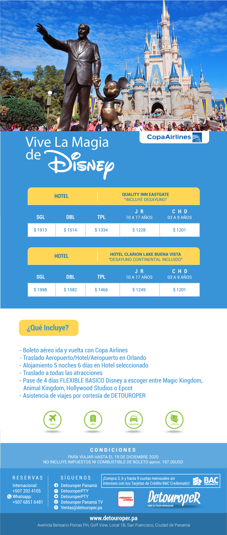 • Pase de 4 días FLEXIBLE BASICO Disney a escoger entre: Magic Kingdom, Animal Kingdom, Hollywood Studios o Epcot.